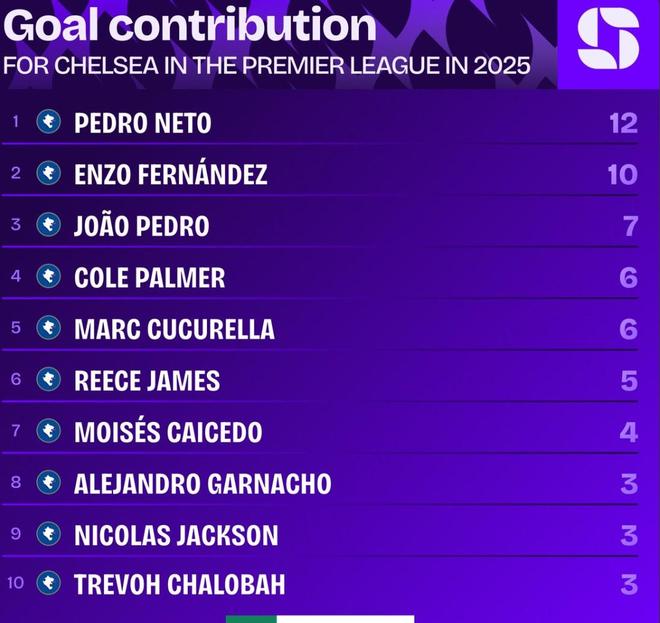 佩德罗-内托2025年英超进球5+、助攻5+,是蓝军队内唯一一人